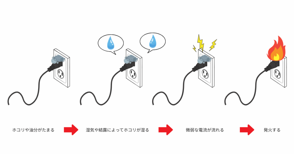 トラッキング火災とは、コンセントやプラグのすき間に付着したホコリや汚れが湿気を含み、微弱な電流が流れ続けることで発火する火災のことです。