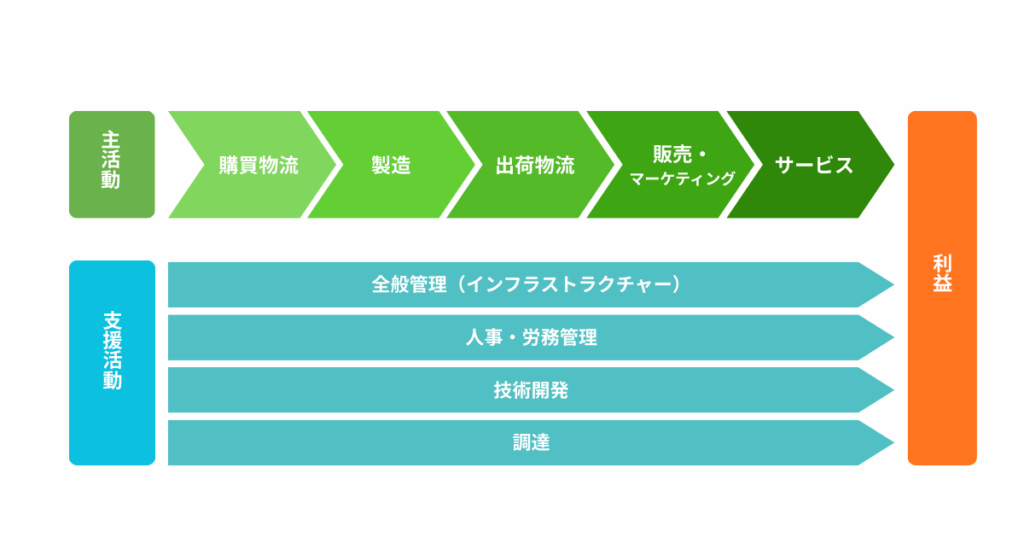 | 役割 | 顧客に提供される製品・サービスそのものを生み出す活動 | 主活動が円滑に進むよう基盤を整える活動 |