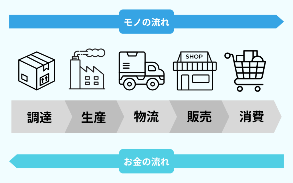 物流はその一部であり、モノを運ぶ・保管する役割を担います。